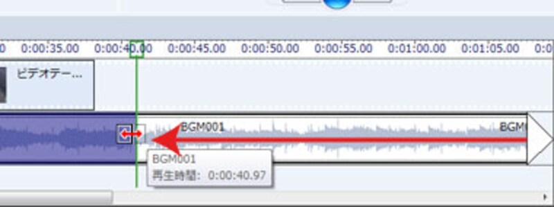 サウンドデータトリミングの基本は、データの先頭や終端をドラッグして調整することです。ここでは、終端をドラッグしてトリミングしてみましょう。まず、終端にマウスを合わせてください。マウスが「←→」に変わりますね。これがトリミング可能な状態です。