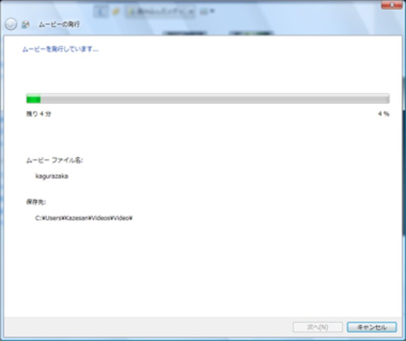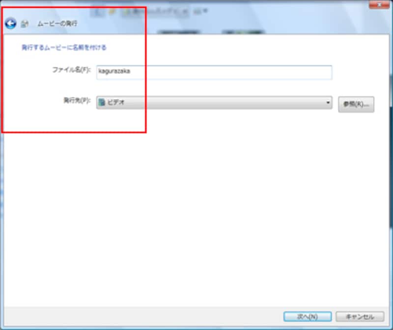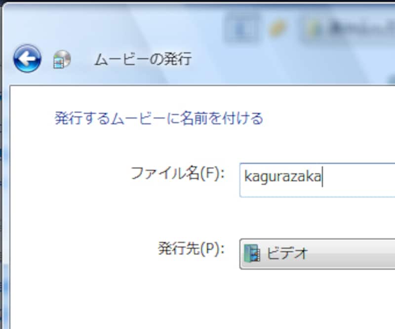 「ムービーの発行」ダイアログボックスが表示されるので、「ファイル名」に発行するファイルの名前を入力します。ここでは、「kagurazaka」と入力してみました。
