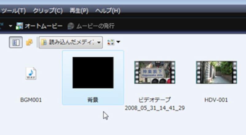 背景データを作成して保存ができたら、これをムービーメーカーに読み込みます。なお、ムービーメーカーへのぞさいの読み込み方法については、「ムービーメーカーでビデオ編集―取り込み編」も参照してください。