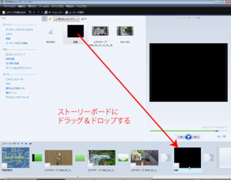 ムービーメーカーに読み込んだ背景の画像データを、ストーリーボードの一番最後にクリップとして配置します。配置は、ドラッグ&ドロップで行うのでしたね(ムービーメーカーでビデオ編集―トリミング)。