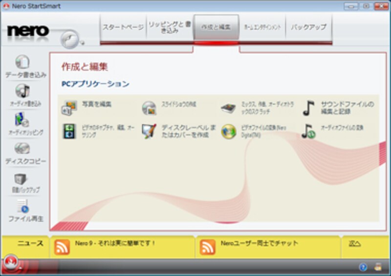 Nero 9を構成するさまざまなアプリケーションを起動するメインコントロールセンター的なプログラムが、「Nero StartSmart」です。ここから、目的に応じてプログラムを起動し、作業を行います。