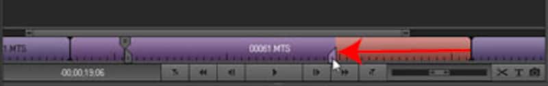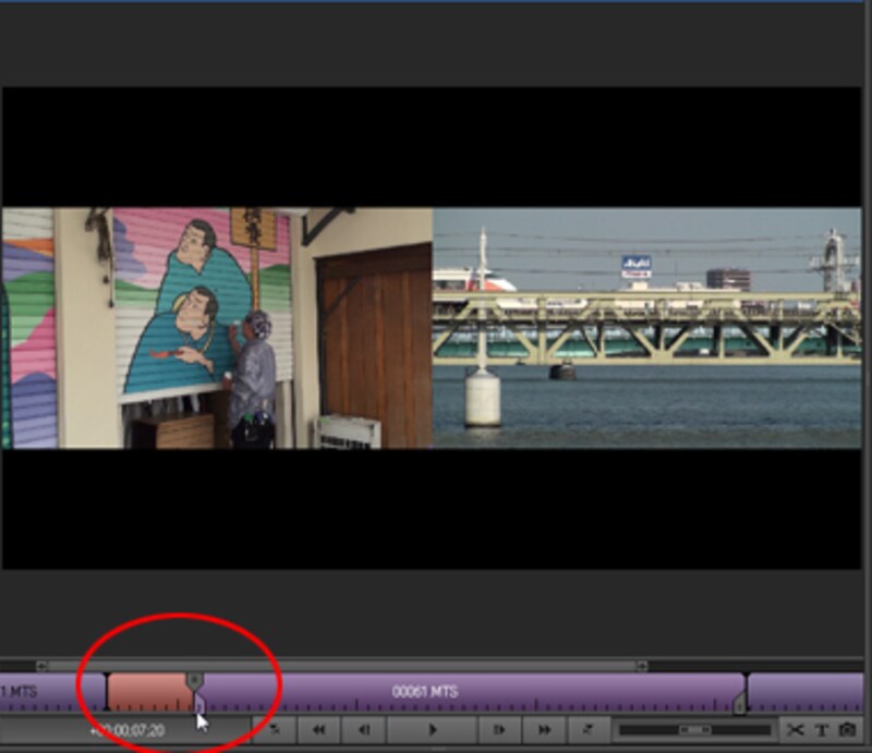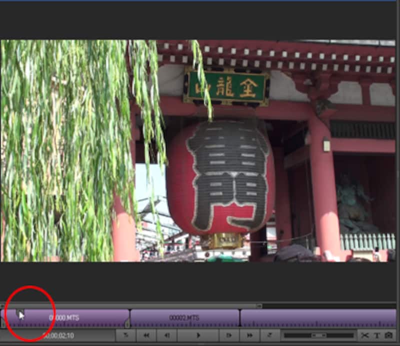 | ▲「時間インジケータ」をドラッグして、開始点(スタート位置)を見つける。 |
