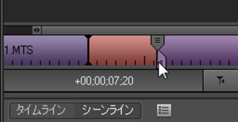 | ▲同じように、終点は、「アウトポイント」をドラッグして指定する。 |