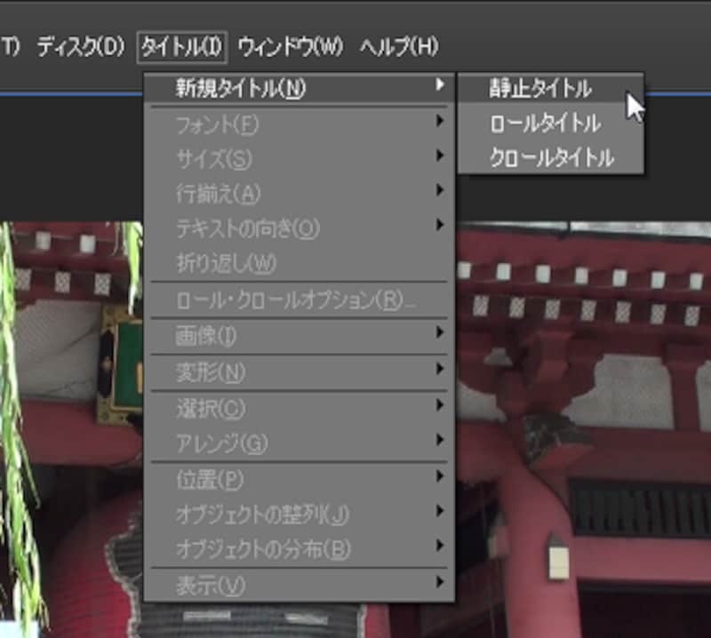| ▲「タイトル」→「新規タイトル」→「静止画タイトル」を選択する。 |