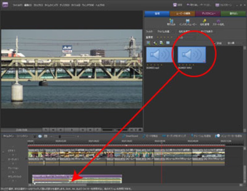 | ▲タスクパネルでオーディオデータを表示させ、利用するクリップをタイムラインの「サウンドトラック」にドラッグ&ドロップする。 |