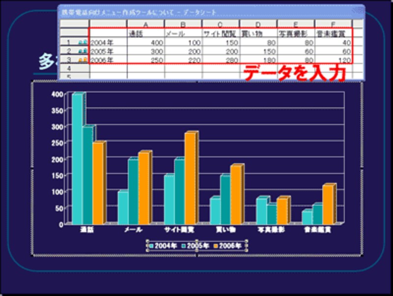 「Microsoft Graph」を使うと、入力済みのデータを削除することなく、ダブルクリックするだけで、グラフ化するデータのオンとオフを切り替えることができる、Excelにはない便利なワザが用意されています。