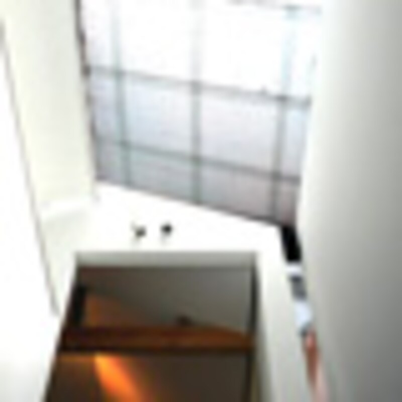 駅前商店街の路地に入ってすぐの住宅街に、突然白い大きな塗り壁が現れます。玄関らしきものもない。見上げれば小さな窓が1つあるだけ。切り妻屋根でなければ、ここが住宅だとすぐには分かりません。さて、その中はどうなっているのでしょうか。