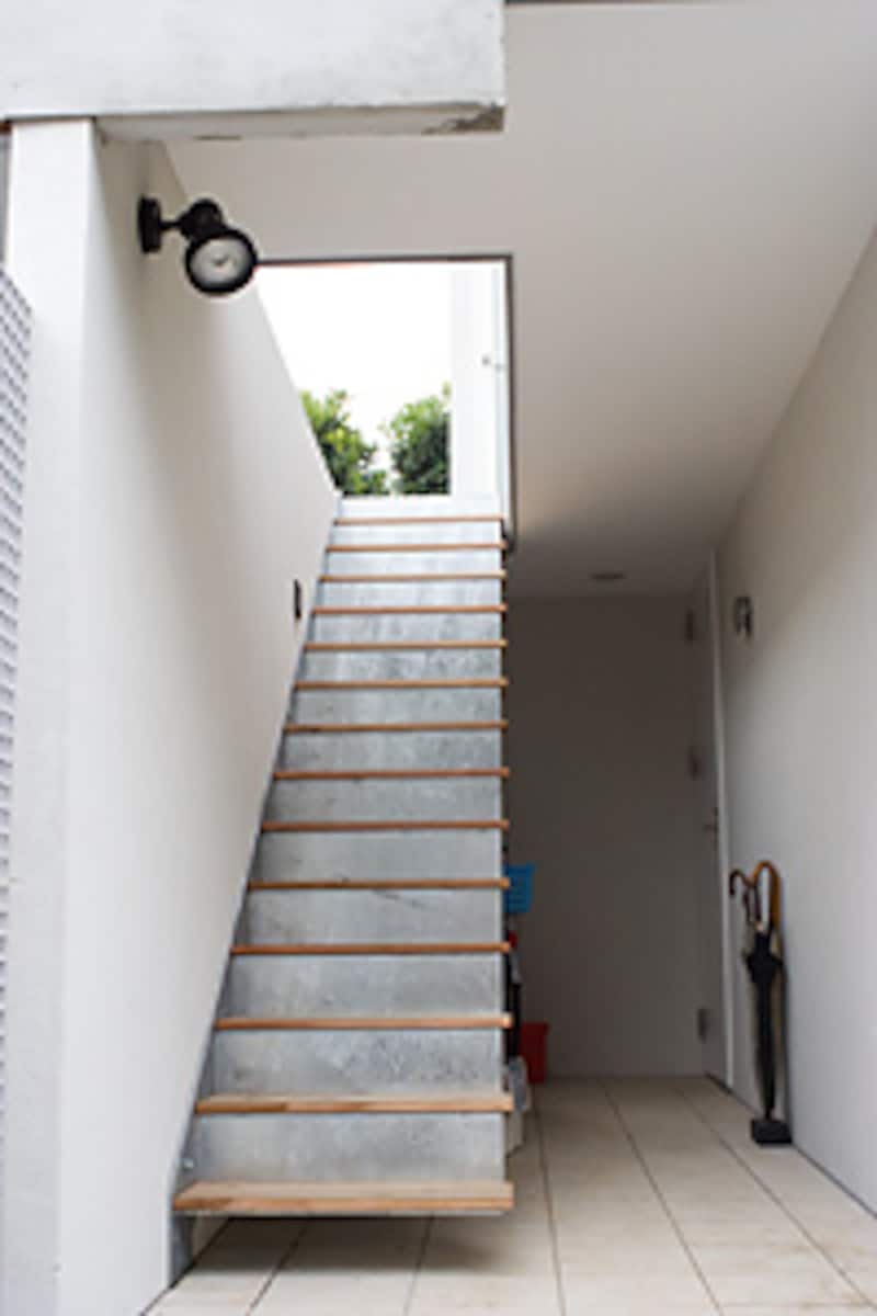 外観は、ルーフテラスを持つガレージが先にあり、その横に母家が隣接するという2棟の構成。ルーフテラスは5柴たちが外と接触することのできる最前線の場所ということで、そこには木製の縦ルーバーが巡らされ、外部への音の漏れを最小限にとどめる工夫がなされていました。![]() |
