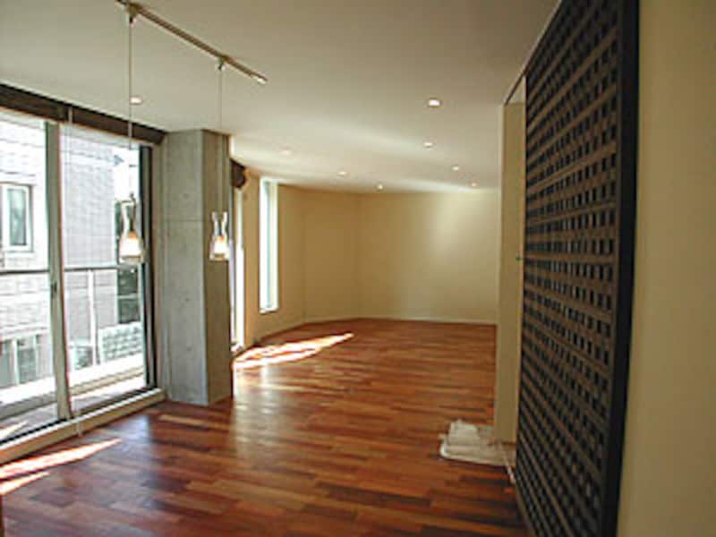 緑と光の小径を通って入る創作住居 光の小径を通って… 世田谷区弦巻5丁目。周囲に公共施設が点在し、図書館・馬事公園・世田谷ボロ市など、いかにも世田谷らしい情緒を残したこの一帯は、誰もが一度は住んでみたいと思うような懐かしさがあります。ゼロワンオフィスの新コーポラティブハウス「T-Treppe」は、この弦巻の閑静な住宅街に、間口の狭さを逆手に取る形で緑と光の小径をつくり、それに沿って各戸を配置した長屋スタイルの集合住宅になっています。 玄関からリビングにいたるアプローチとしての階段、この距離感がいい1軒目は、外の小径から内階段を上って室内にいたるスタイルの住居。入ってすぐがリビング、奥がキッチン+ダイニングという構成です。おもしろいのはここから上の階のプライベート空間に行くにはらせん階段を使うということで、ひとつの室内にふつうの階段とらせん階段が“同居”する形になっています。 こんな既成概念にとらわれない自由さも、ゼロワンオフィスの「創作住居」らしくていいですね。おそらく、内階段がまだ“外”、らせん階段は完全な“内”という意識なのでしょう。上の階は主寝室ともうひとつの個室が廊下をはさんで隣り合わせに配置されていました。 上がり框からリビングに入る感じ、壁を隔ててダイニング 上階へはらせん階段を使う、ここは完全な“内”という認識 「内」と「外」、「静」と「動」が同居する ギャラリーとしても使えそう つぎも同じく内階段を使うスタイルの住居ですが、こちらの内階段はどちらかというと完全な“外”。とはいえ、好きな絵などを掛ければたちまちギャラリーに変身しそうな空間ですね。ここから格子の引き戸を開けて室内に“入り”ます。入ってすぐに室内を見渡す形でキッチンがあり、そこから微妙に折れ曲がった形でダイニング+リビングが広がっています。 LDKは、全面開口だからじつに明るくて開放的。住み手の方は、たぶんここでほとんどの時間を過ごし、夜更けになったら玄関脇から分岐する寝室+バスルームのプライベート空間に移動されるのでしょう。プライベートのほうは、LDKの“動”に対して“静”の空間。閉ざされた“密な”印象になっていました。 途中で折れ曲がっているため、奥行きが感じられる 司令塔のようなキッチン、玄関左手からが“静”の空間 -->>まだまだ続きます!12次のページへ