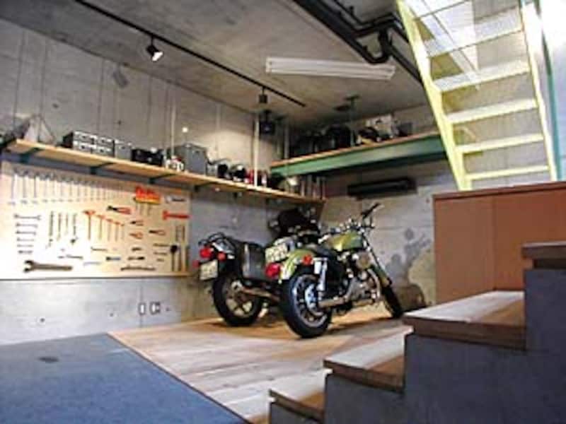 | 内部スロープを上がっていくと、 BMWとハーレーの2台のバイクが鎮座する土間 |