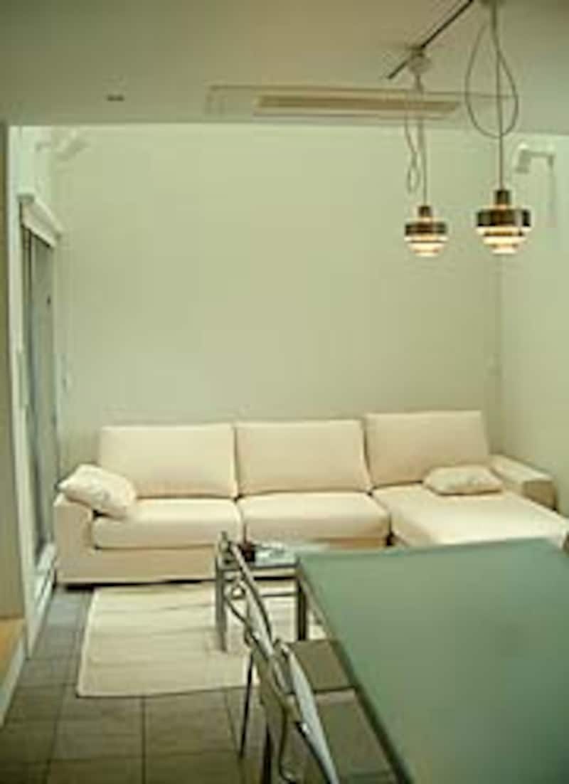 キッチンを食器棚兼衝立の向こう側に配し、衝立をスクリーンがわりにして簡易シアターをつくるなど、遊び心もいっぱいです。さらに、床材や特注のサッシ、ガラスのテーブ ルやイタリア製のファニチャー類と、素材&インテリアへのこだわりぶりもかなりの もの。たしかに一見して分譲マンションのありきたりなパターンとは大きく違う。そ れは一戸建ての感覚といってもいいでしょう。