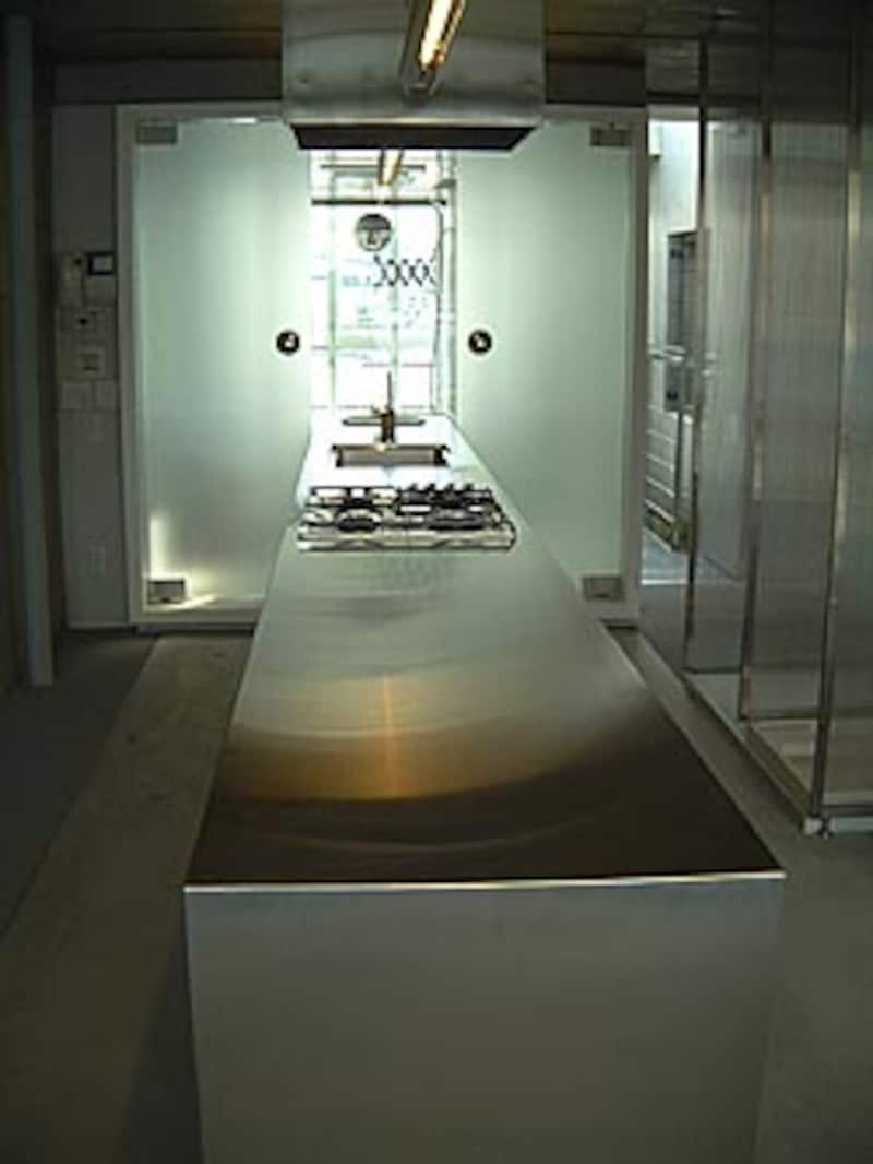 玄関を開けて入ると、すぐ長細いキッチンとを兼ねたステンレスのテーブル。そこはキッチンであり、ダイニングであり、リビングでもあるわけです。
