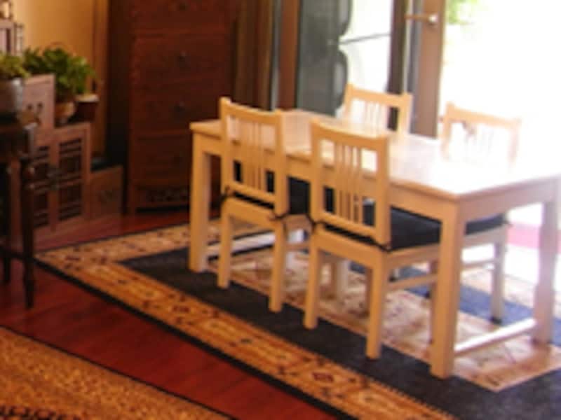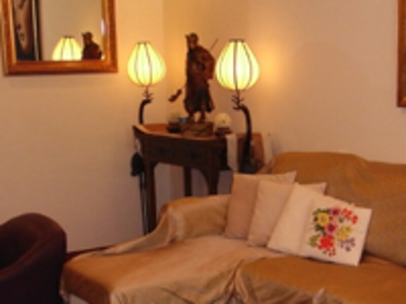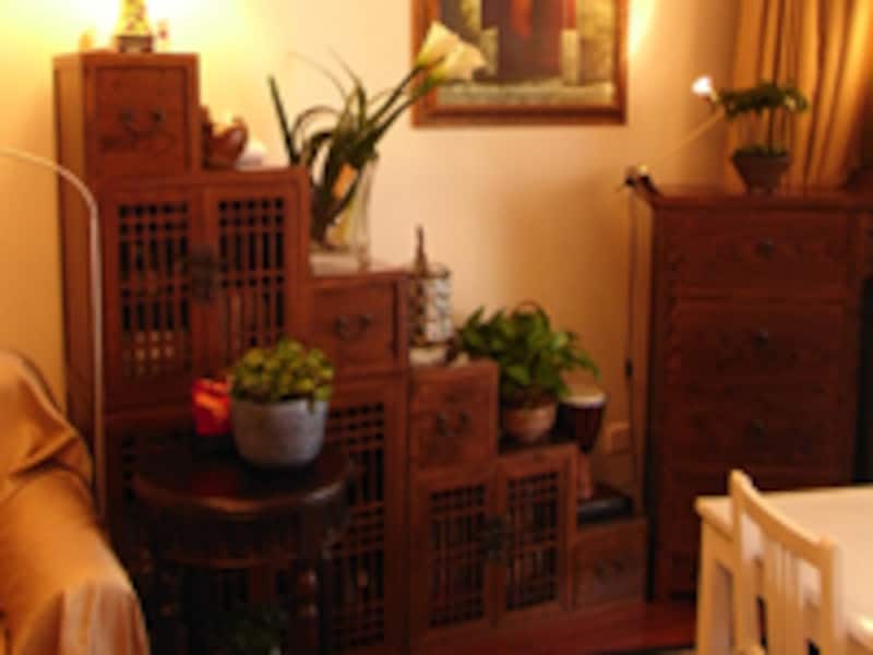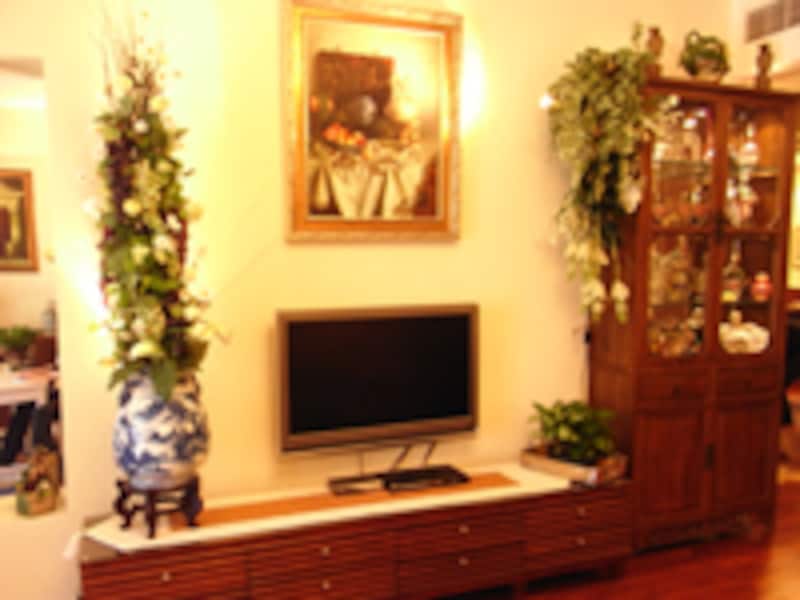 照明が組み込まれた飾り棚にも、柔らかな曲線が使われて、中国風と西洋風のデザインがミックスした印象です。テレビ下にある、モダンなデザインのキャビネットは、部屋の備え付けのものですが、ちょうど飾り棚と色が近いので気になりませんね。