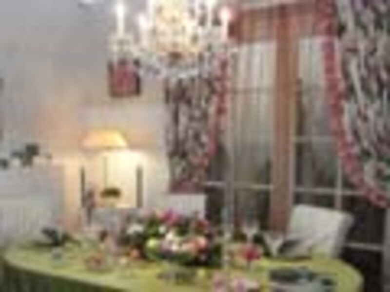 上のダイニングもグリーンとアイボリーを組み合わせた爽やかなインテリアです。壁面には若葉が出たばかりの木を描いたファブリックを大きめに吊り、春らしい雰囲気を出していますね。気に入った柄のファブリックを中心にコーディネートを考えても面白いですよ。