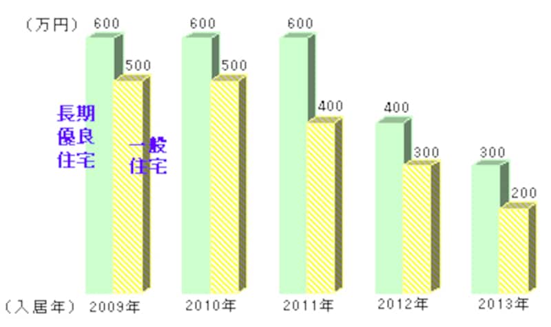 一方、長期優良住宅の場合には、年末残高の限度額が2011年まで5,000万円(控除率は1.2%)、2012年が4,000万円(控除率1.0%)、2013年が3,000万円(控除率1.0%)となっています。