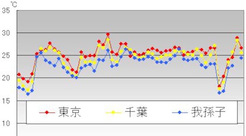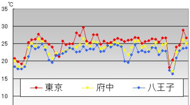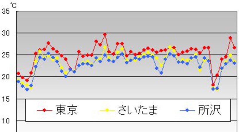 さらに同一都県内の中核都市 (気象庁による観測地点より抜粋) との間で比較してみると、他の気象条件は似通っている場合が多いだけに最低気温の差が明確になるようです。今回は首都圏のデータをピックアップしてみましたが、名古屋、大阪、福岡などの大都市圏でも、おそらく同様の結果が得られることでしょう。