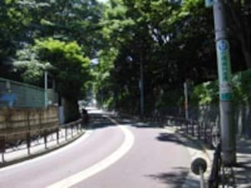 筑波大学学校教育部の脇にある通りで、道幅も広くゆるやかな坂です。車や人の往来も多くなっています。通り沿いの区立窪町東公園を挟んで、うっそうとした森が広がっています。