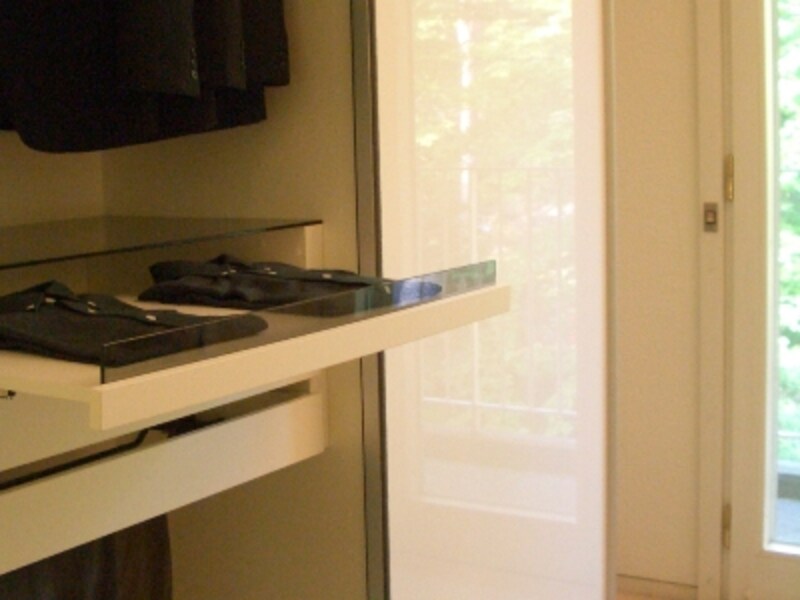 | 「ティセッタンタ」のワードローブ収納。上からジャケット、シャツ、ネクタイ、パンツとそれぞれ専用のパーツが組まれている。鏡面仕上げのスライド扉に森の緑が写りこむ |