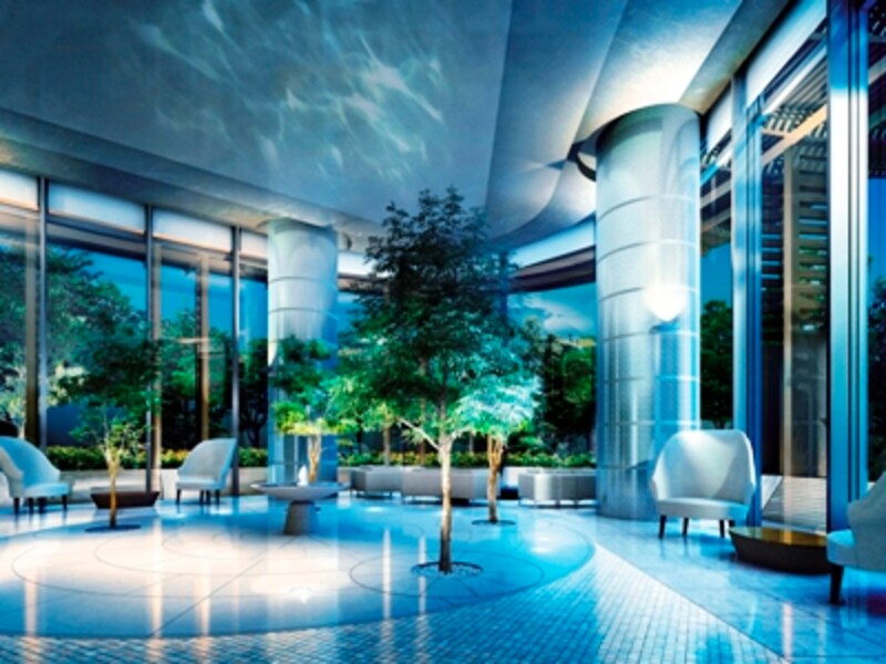| 『パークコート赤坂ザタワー』コンサバトリー。薬研坂からタワーに入ると水の湧き出る吹き抜けの空間が。四季の移り変わりを堪能できる |
