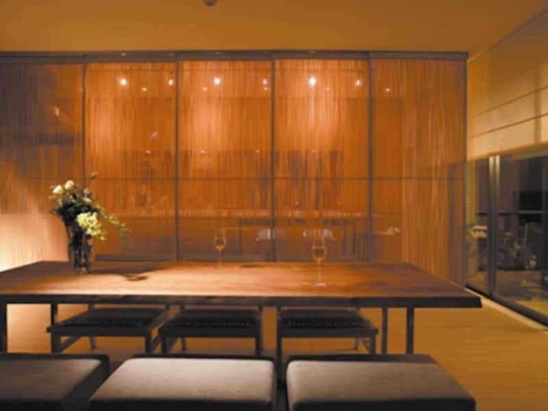 | 上の写真から、キッチンとリビングを区切ったら、こうなる。空間は分かれるが照明の明かりと引き戸の透明感により奥行き感は失わず。視覚的な広がりは区切られないようになっている |