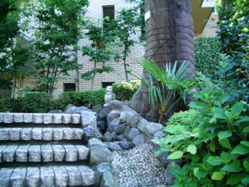 | 石段、草木、ふくろうのオブジェ……公開空地ながらとても丁寧に作りこまれている。「東急ドエルプレステージ瀬田」は99年3月竣工。設計:日建ハウジングシステム、施工:戸田建設、事業主:東急不動産 |