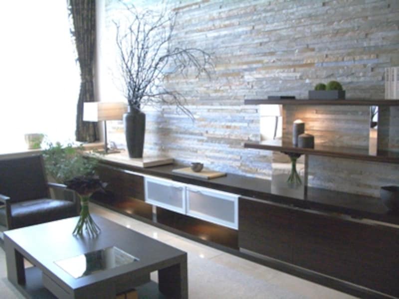 | 天井隠ぺい型エアコンが高級感のあるナチュラルモダンな空間を演出。石貼り飾り壁もこの立地だからこそ、自然でシックなインテリア提案に |