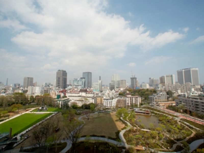 | 眼下には檜町公園の水と緑。そしてその向こう側に赤坂の街が広がる |