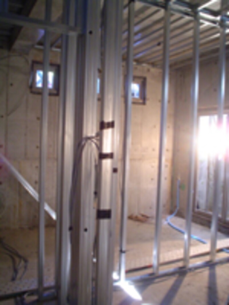 内部の間仕切り壁の骨組みにLGS(軽量鉄骨)を使用。木軸と比べて、工期の短縮が図れ、リフォームに対応しやすいというメリットがある。