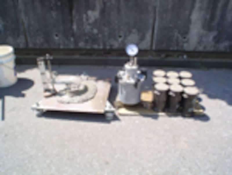 ミキサー車で運んできコンクリートの一部を抜き取り、スランプ値、空気量、塩分量、温度などを測る。