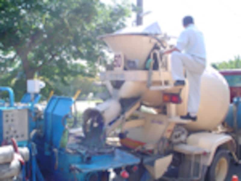 ミキサー車からポンプ車へコンクリートを移している。ミキサー3台ぐらいで工場と現場を往復し、コンクリートを運ぶ。間があくと、コンクリート硬化により強度に影響がでる。