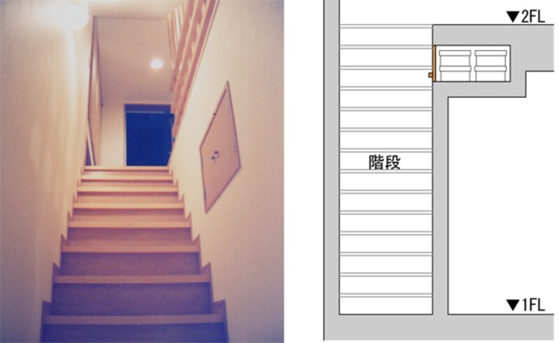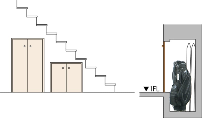 階段下収納階段下は高さがとれないために使われていない家が意外と多いのですが、ここにスペースとれば、掃除用具や日用大工道具程度であれば簡単に収納できます。床のレベルを基礎まで下げると、ゴルフバッグなど背の高いものも入ります。
