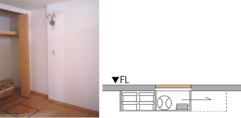 天井懐(ふところ)収納階段に接している天井の懐に収納を設けてあります。高さが取れないため一見不便のように感じますが、スキーなどといった長いものの収納に便利です。また、玄関収納が十分とれなかった時など、普段履かない靴などを入れておくスペースが他にあると、玄関収納が小スペースでもスッキリ片付きます。