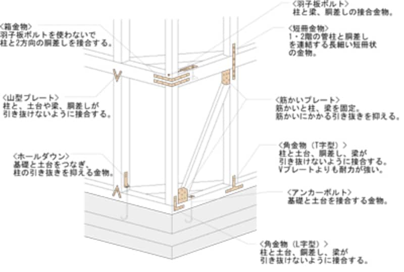 木造のフリーメンテナンス期間は30年と言われていますが、日本古来の木造建築・法隆寺などを見てもわかるように、大事に住まい定期的に手を入れてあげることで耐久年数は長くなります。阪神淡路大震災でも、筋かいなどで耐久性を高める措置がしっかりしていた木造住宅は、被害を免れたという調査結果がでています。木造住宅を強くする手段として使われる接合金物は下記のものがあげられます。仕上げ材で軸組みが隠れてしまう前に、これらが正確に施工されているかチェックが必要です。![]() |