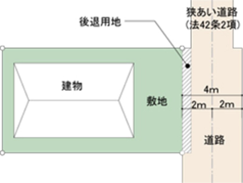 この道路については、その道路の中心線から両側へ2m(大きな川、ガケなどの場合は道路の反対側から4m)後退した時点で4mの道路幅員が確保されることになります。従って、この道路に接して家を建てる時は、2m以上セットバックした線から建物などが出ないようにしなければなりません。そして、セットバックした分、敷地面積は小さくなります。
