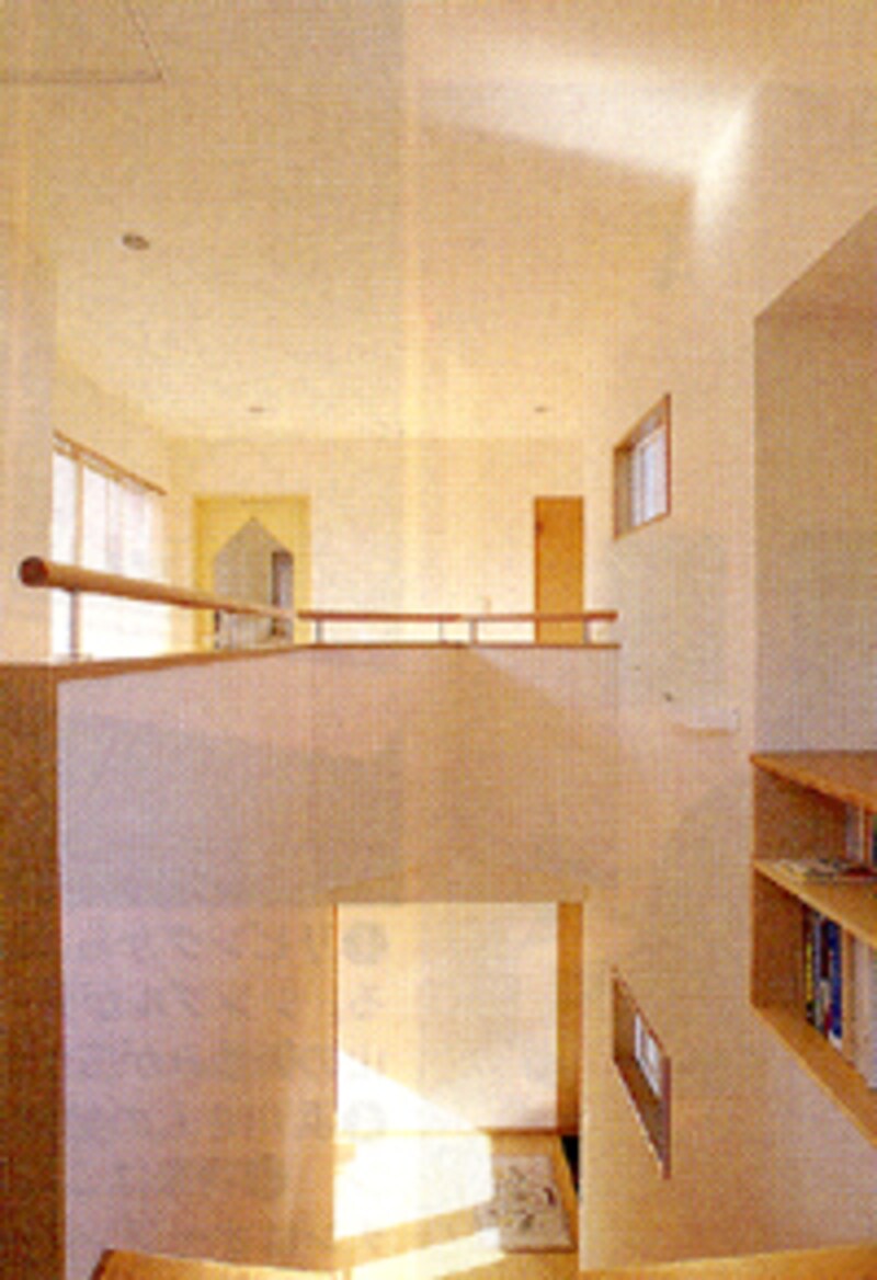 | 階段の踊り場に設けた読書コーナー(N邸) | 階段の踊り場から撮影。 右に見えるのが階段側面に設けた本棚(Y邸) |