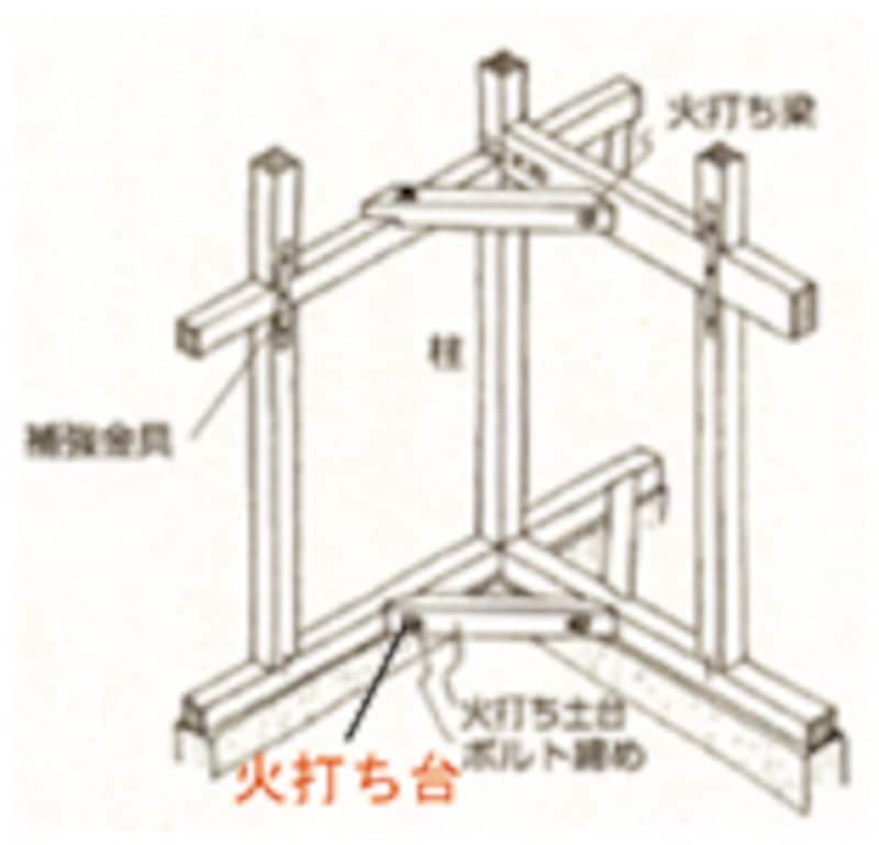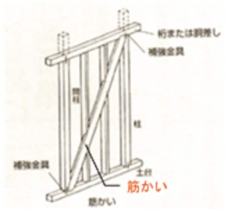 | 柱と桁または胴差しの間に対角線上に渡し、地震の横揺れで軸組みがゆがむのを防ぐ。柱と桁・胴差しとは金物でしっかり接合する。 | 建物の隅部分にある土台や梁の変形を防ぐのが火打ち。土台に入れるのが火打ち土台、梁に入れるのが火打ち梁と呼ばれる。土台や梁とはボルトでしっかり接合する。 |