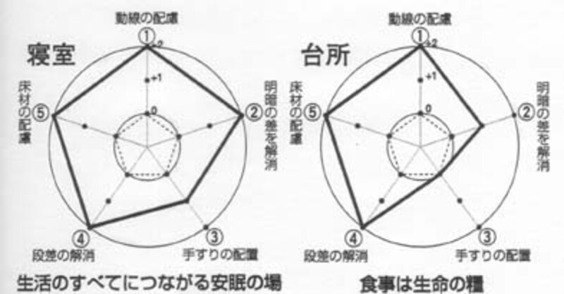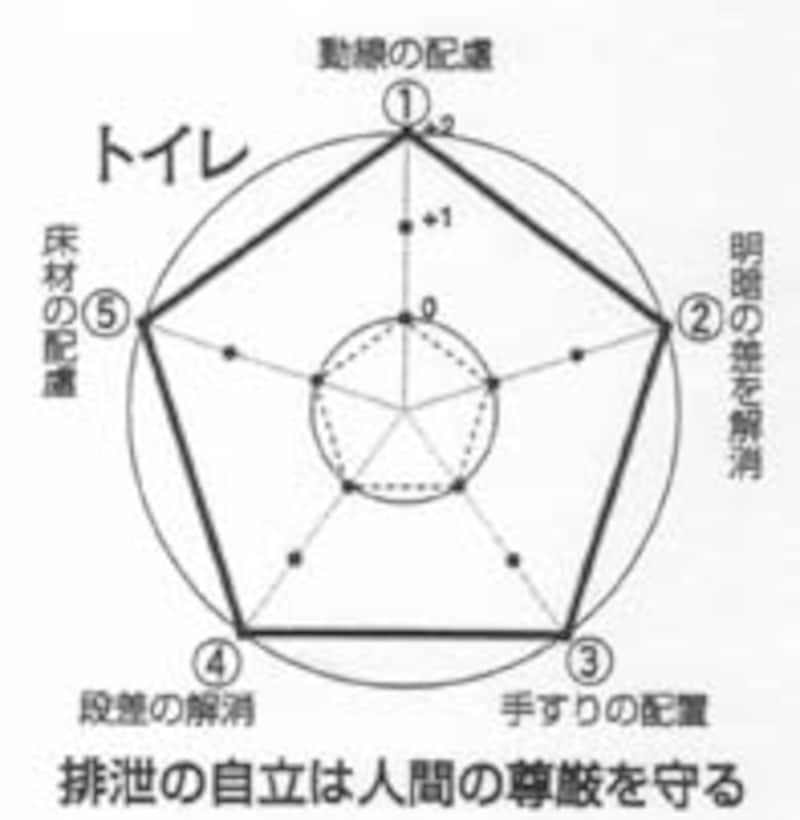 各室別に何が重要視されるかを検討し、グラフにしてみると、浴室・洗面脱衣室・トイレは特に配慮が必要なことがわかります。○転ばぬ先の杖5つのポイント※点線の正5角形を標準値「0」と仮定し、「+1」「+2」と周囲に広がるほどその重要度が求められます。※「つくるならこんな家」佐川旭著(住宅新報社)より抜粋前のページへ123次のページへ