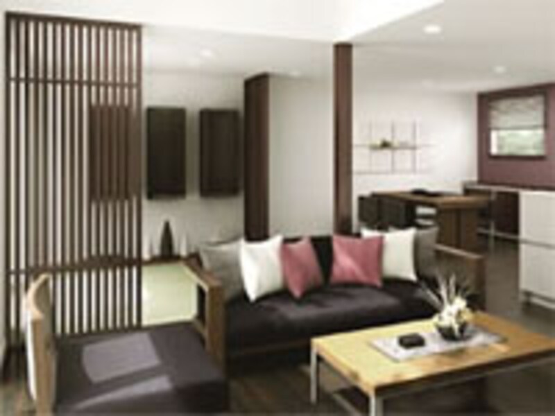 そんな場合、ある程度の開放感を失わずに空間を仕切ることのできる造作材、たとえば、格子を用いてみる、というのもひとつの方法ではないでしょうか。格子は、縦に細い桟木や竹を一定間隔に並べた日本の伝統的な建具。この格子を空間に配することで、ゆるやかに室内を仕切ることが可能です。視線や光を適度に遮ることができるので、家族の気配を感じることもできますし、空気の流れを妨げないため、暖房・冷房や汚れた空気がよどむ心配もありません。