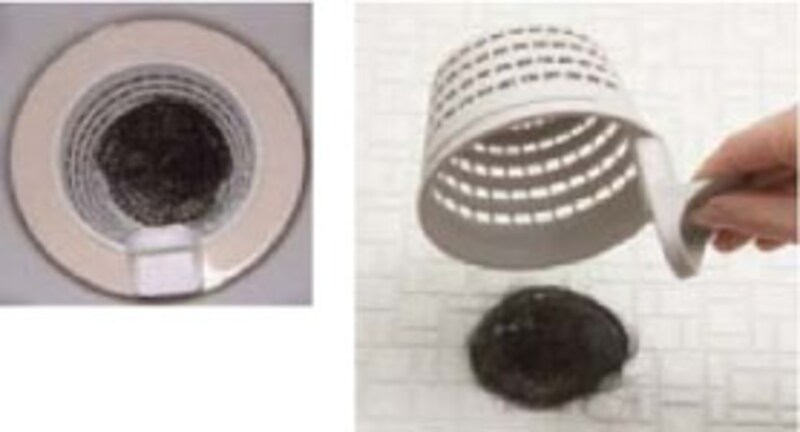 排水トラップ内に「うず流」を発生させることで、毛髪やゴミがくるくると回り、カゴ形状のヘアキャッチャーの底にまとまるので簡単に捨てることができるというわけ。また、カゴ網の三角形状の断面が「うず流」をヘヤキャッチャー内に誘導、汚れをすすぎ流すとか。すすぎ流すことで、排水口に汚れが付きにくくなり、ヌメリの発生も抑えることができます。「うず流」を起こすエネルギーは浴槽の残り湯、という環境面でもやさしい工夫と言えるでしょう。