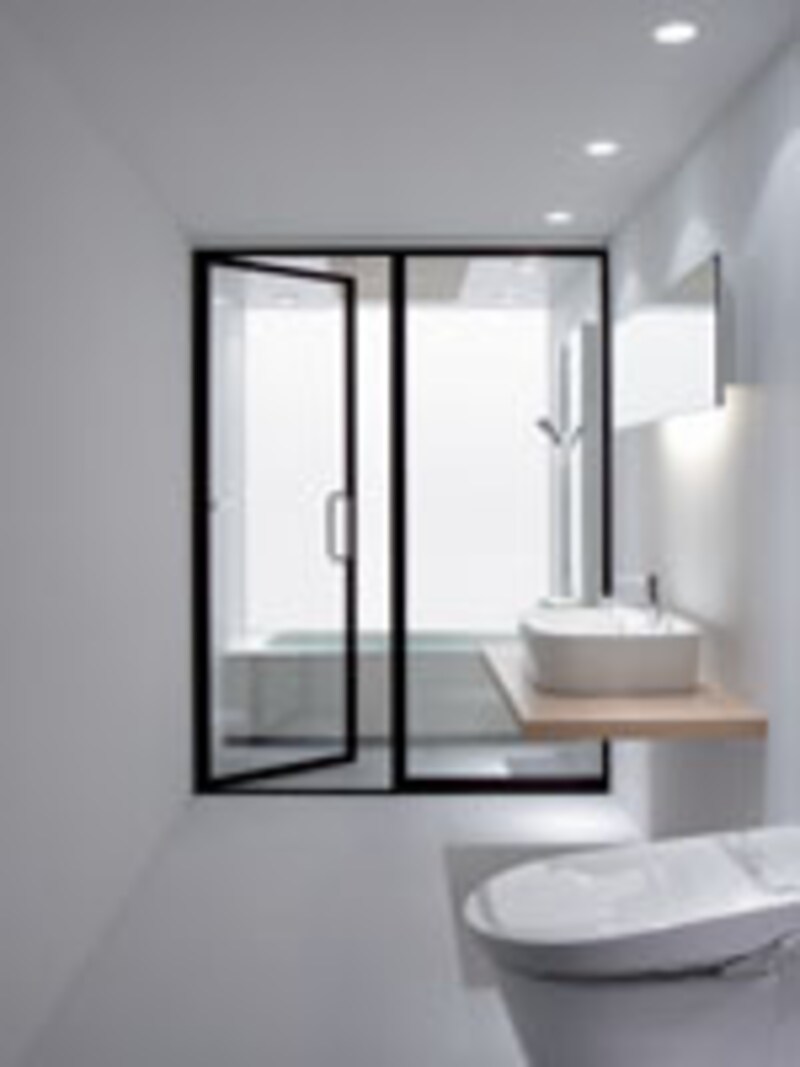 また、最近は浴室だけでなく、洗面やトイレ空間との繋がりを求める声も高まっています。この商品の場合も、3部屋を一体化させた水まわり空間を提案しています。浴室と洗面室をつなぐ細いドアフレームは、空間の連続性を高めていますし、浴室と洗面室の床を揃えることも可能です。浴槽と同様の人造大理石の洗面ボウルなど、好みに合わせた空間づくりを実現できるとか。