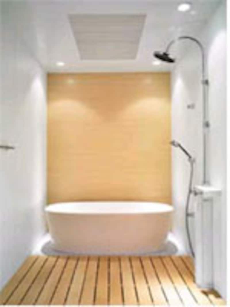 | すっきりとした空間に据えられた人造大理石の浴槽。腐りにくい加工処理を施した米ヒバのすのこを敷くことでやさしい風合いの空間に |