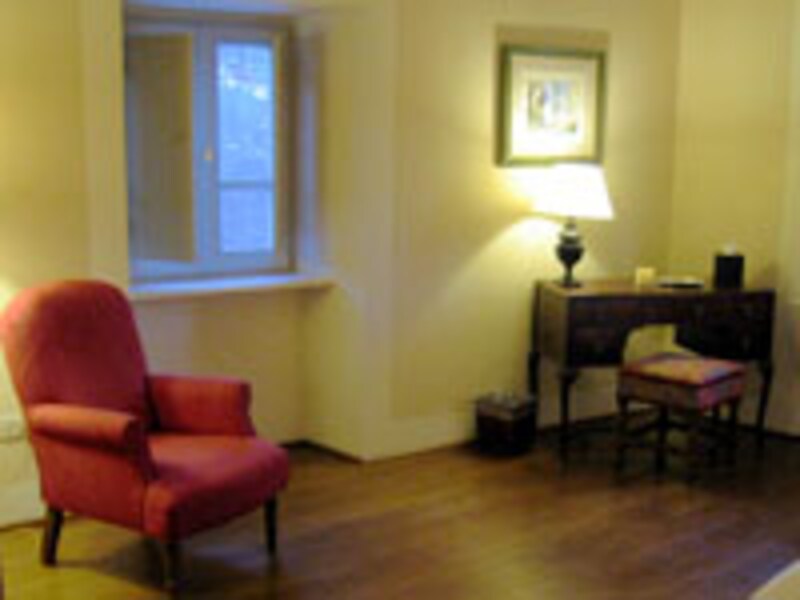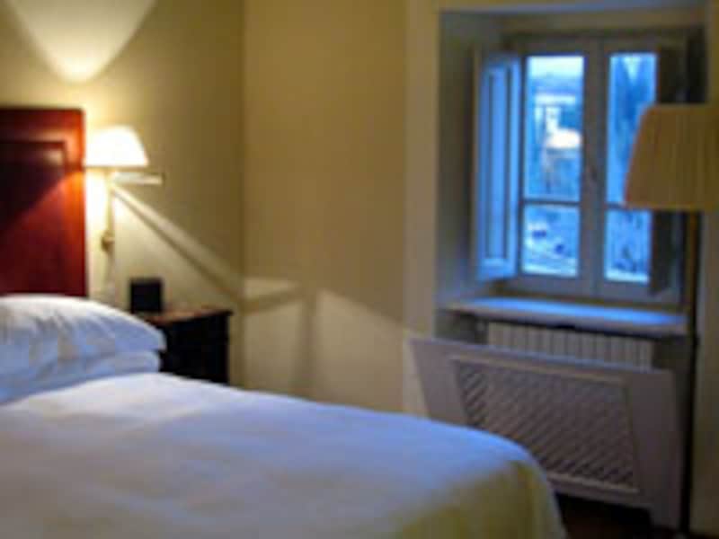 メインベッドルームは大きなキングベッドが小さく見えるほど広く、二人では淋しく感じるほどのおきさです。ワードロープ、チェスト、デスク、などが散らばっています。幾つかある小さな白枠の出窓の下には近代的な暖房機が設置され、ガラリ戸が付けられ窓からは中世の町並みと自然を見ることができます。