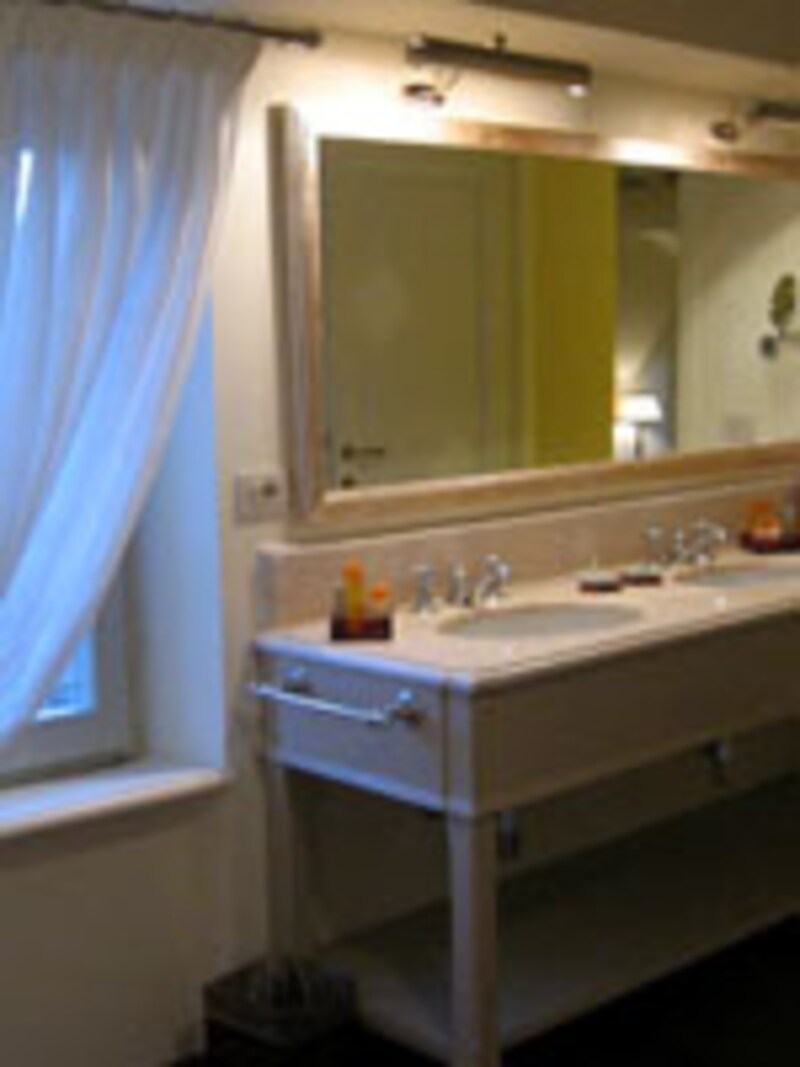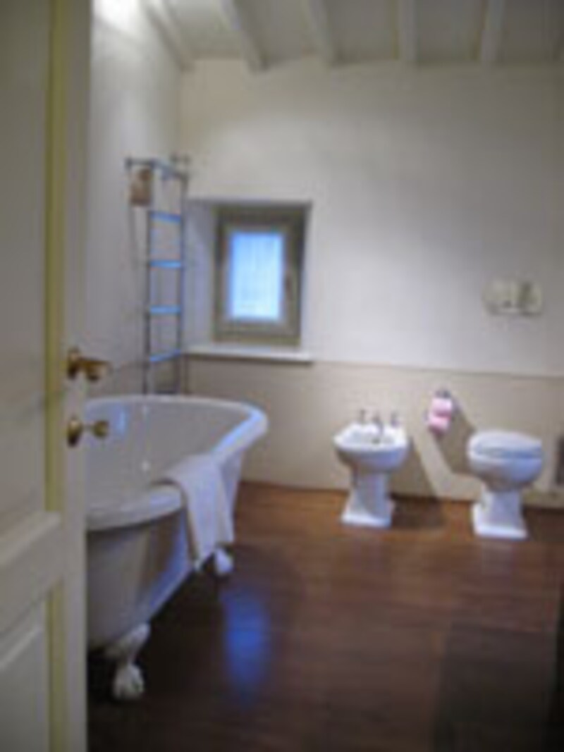 メインベッドルームのバスルームもかなりの大きさがありました。大きく開かれた窓にはヒダをたっぷりとった薄いレースがかかり、木製の床の上には、デンとクラシックの浴槽が置かれています。大理石のカウンターの洗面台は木製、全ての水栓金具はクラシックなものです。もちろんタオルやアメニティーはすべてフェラガモオリジナルです。