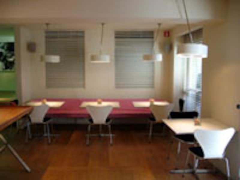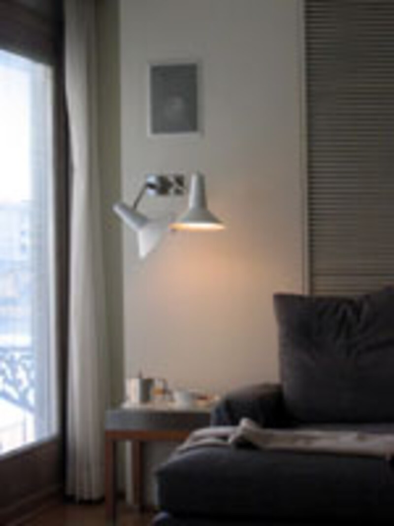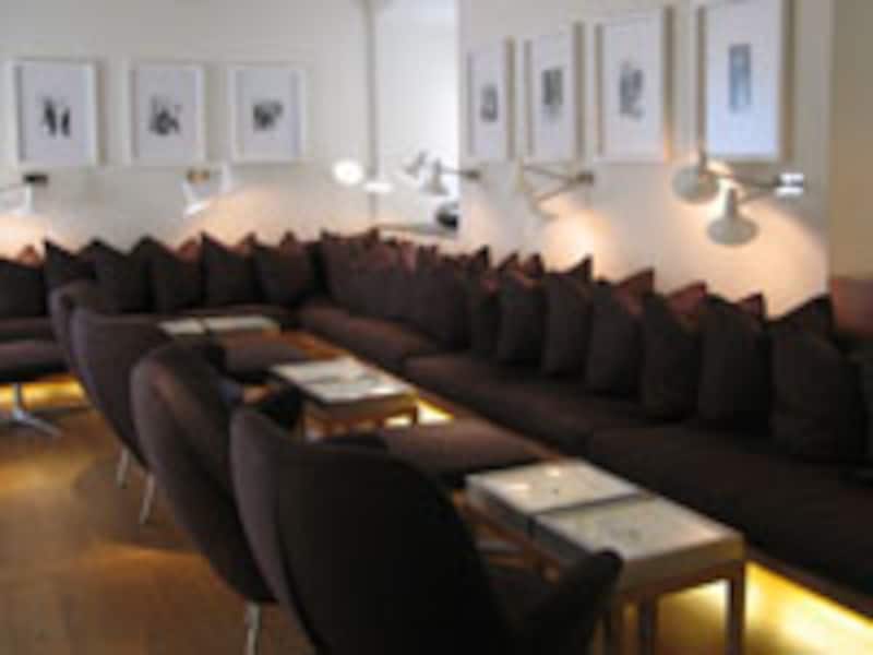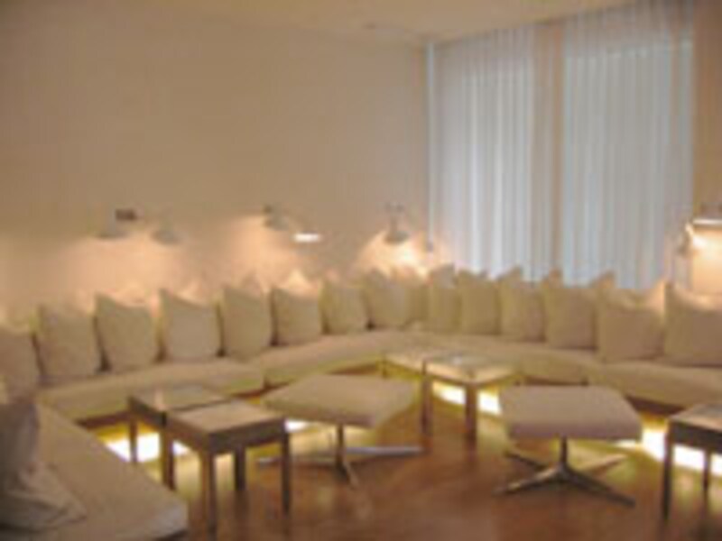 ホテルの中には、二つのラウンジがあります。一つは落ち着いたブラウンで統一されています。もう一つは、ナチュラルウッドの床の他は、なにもかも真っ白なラウンジでシアター室になっています。空間全体が雲のように浮き上がって感じます。余談ですが、このホテルのエレベーターには驚かされます。白いソファとミラーでコーディネートされた“動く小さな部屋”になっています。