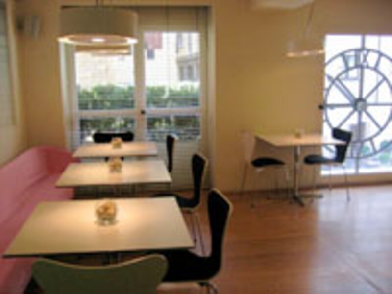 ピンクのベンチにハイテックモダンな家具、オリジナルライティング、コンテンポラリーのデザインの中にもフェミニンさがあります。右の写真の窓に映る時計は、このホテルのシンボルの時計です。歴史の残像楽しむ古い街並みの中にあるからこそ、タイムレスをコンセプトに、同じデザインの時計がテーブルとして使われています。