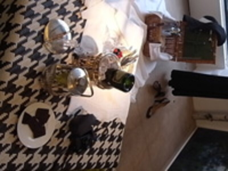 ケットの上に置かれたピクニックバスケット、テーブルにセッテイングされたティーセット、脱ぎ捨てられたシューズに衣類などまるで森の中でピクニックを楽しむかのようなシーンに演出されています。なぜか、自然の中ではふさわしくないクラシックなシャンデリアが吊り下げられています。従来の概念ではないタブーを楽しんでいるかのようです。