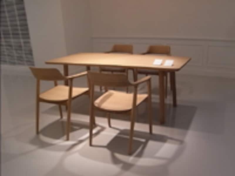 白い空間に置かれた「HIROSHIMA」(ヒロシマ)シリーズは、日本の家具ではあまり見かけない凛とした空気が流れていました。デザイナーの深澤直人氏は「長く使っていくうちに生活の味がしみ込むようなものがいい。」「北欧の白木のそれのように今までに世界の定番となってきた木の椅子にはデザインというよりは工芸的な手作りのぬくもりがあります。日本の木製製品にも同じような工芸的な要素はありますが、特に檜を中心とした無塗装のものには、精緻で、汚れを許さない神格化された清潔感があります。人間的な温かみがありながら精緻で清浄なイメージというのがこの椅子とテーブルの目指すものでした。」と語っています。