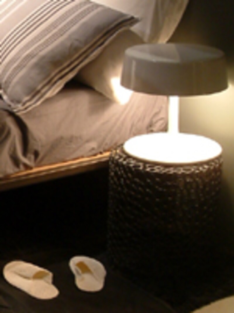 ベッド脇に飾られたのは、真っ白なランプスタンド。モノクロの世界でのスパイスは力強いホワイト、光りを浴びて強く輝きます。ストイックなシンプルを避けるようにベッド上に置かれたのが、ストライプ柄のリネン100%のピロー。上質な麻が持つ確かな存在感が居心地良さを誘います。
