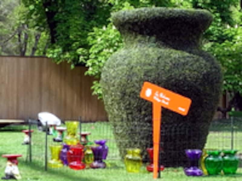 5メートルもあろうかと思われる大きな植栽の壺、その下にはフィリップ・スタルクのスツール“Boheme(ボエム)”が置かれていました。それを見守るかのように、芝の上は何故か“こびと”の人形が点在しています。