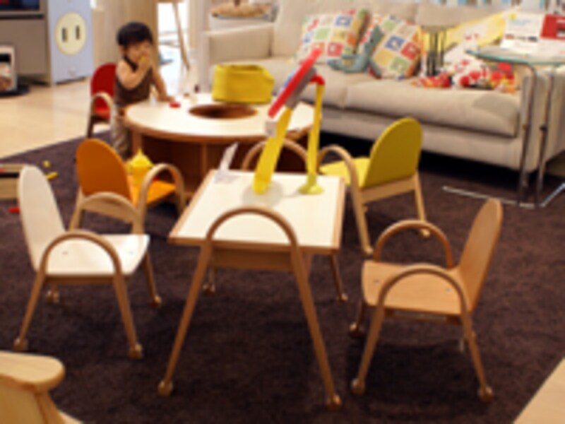 普通の家のリビングソファ、その前に並べられたキッズチェアたちはシンプルで人気の高い「n-kids」。小さなテーブルと椅子があればコドモはすぐに仲良し、ママがお買い物でも安心して一人遊びできます。コドモと大人が交わるリビングには最適です。